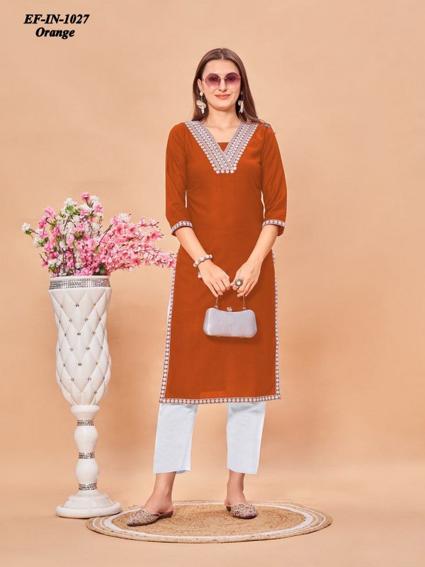 Product Code: EF-IN-1027Kurti: RayonPant: No Pant Work: Embroidery WorkSleevs: 3/4Kurti Length: 44+"Size: S,M,L,XL,2XLColour: 5